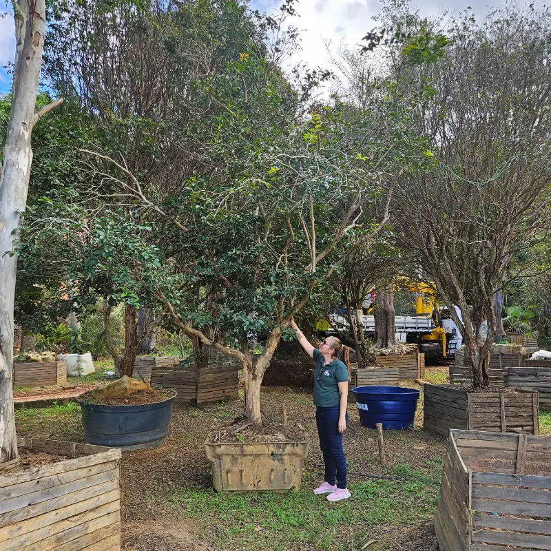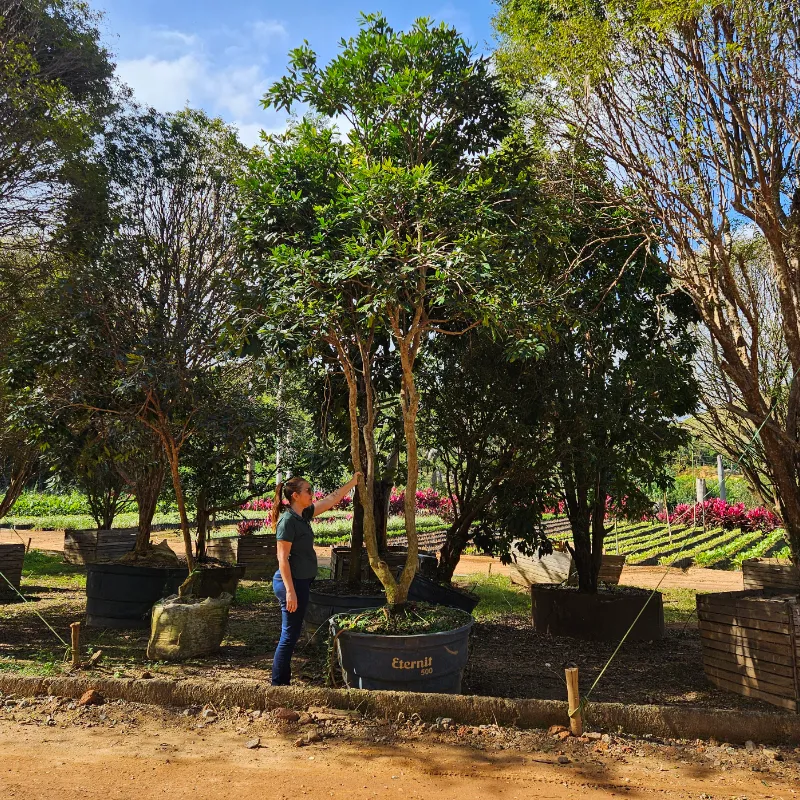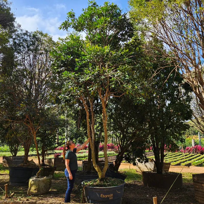A Cambucá é uma árvore nativa da Mata Atlântica, de crescimento médio, que pode atingir entre 8 a 15 metros de altura. Possui copa densa e arredondada, folhas verde-escuras e brilhantes, e flores pequenas esbranquiçadas que brotam diretamente no tronco, numa característica chamada caulifloria. Seus frutos são grandes, amarelo-alaranjados, com polpa doce e suculenta, semelhante ao sabor do abricó. Ideal para reflorestamento, pomares agroflorestais e paisagismo tropical. Prefere solos férteis e bem drenados, com alta umidade e clima quente e úmido. Esta é uma planta adulta, pronta para replantio em áreas urbanas ou rurais.