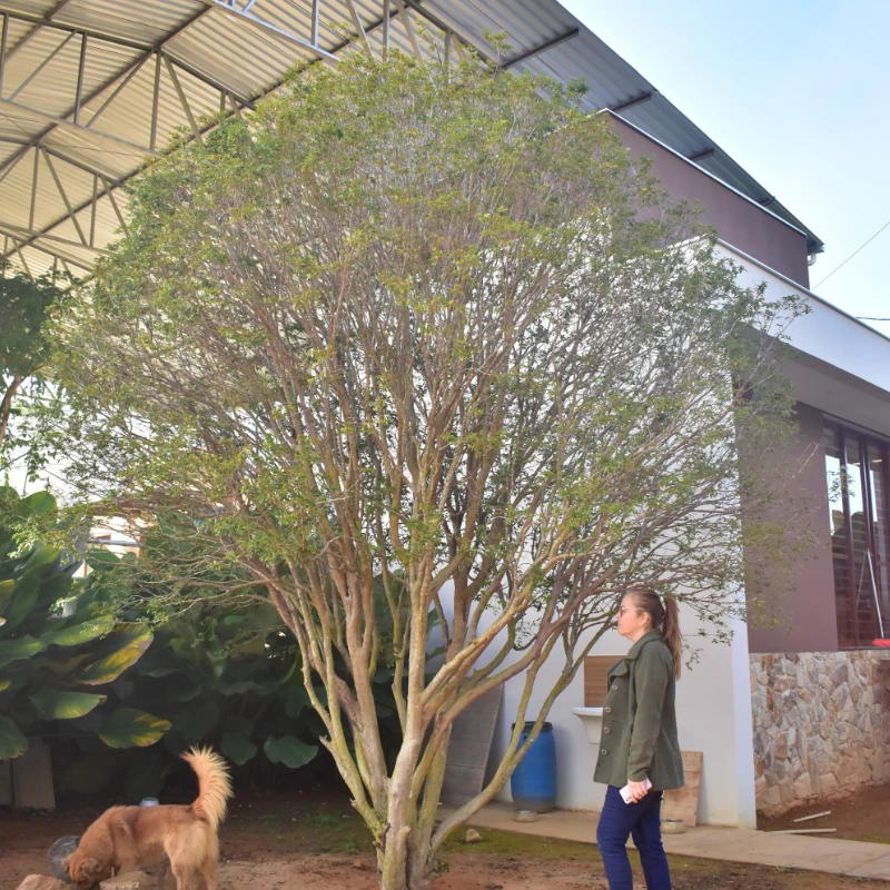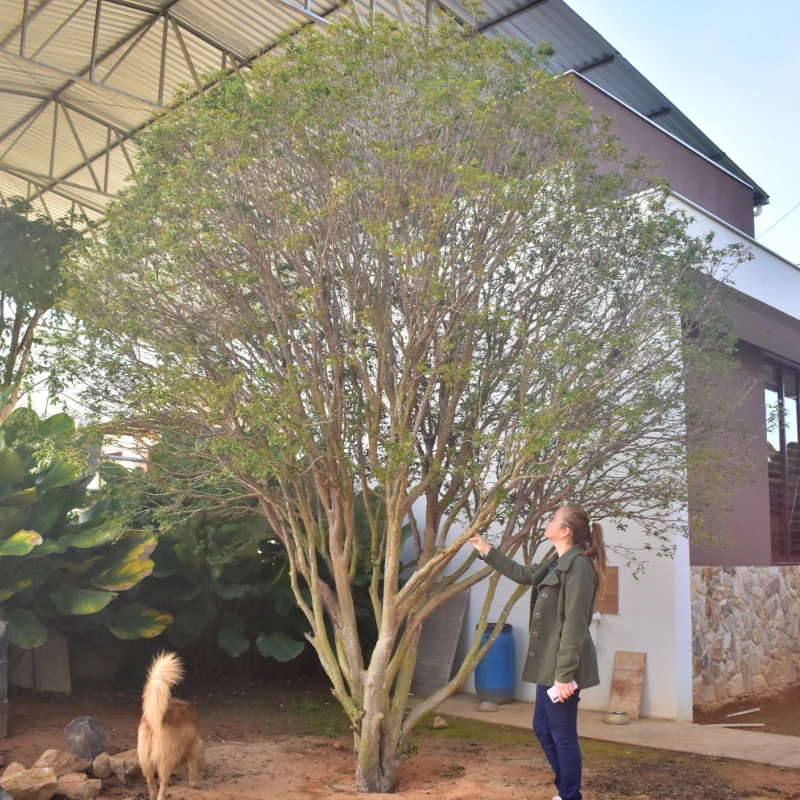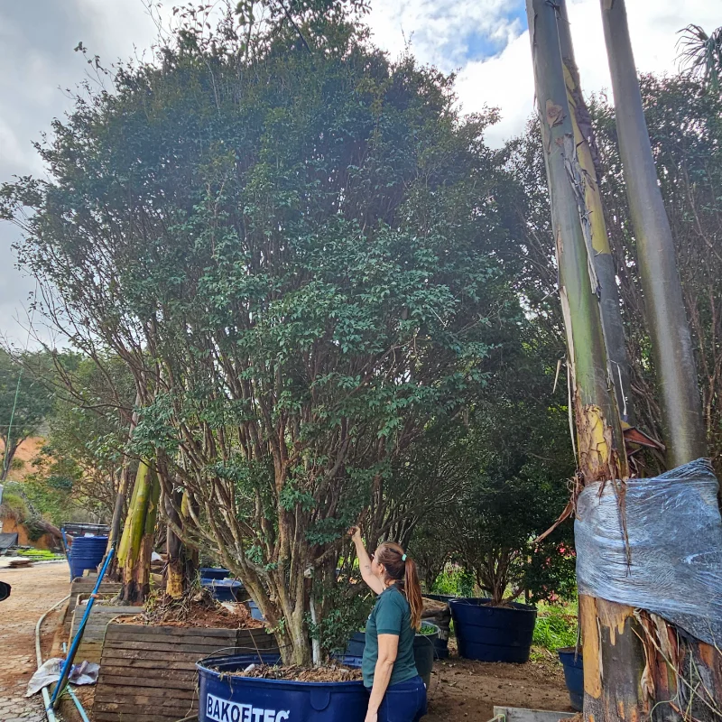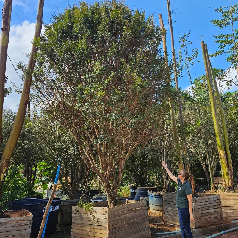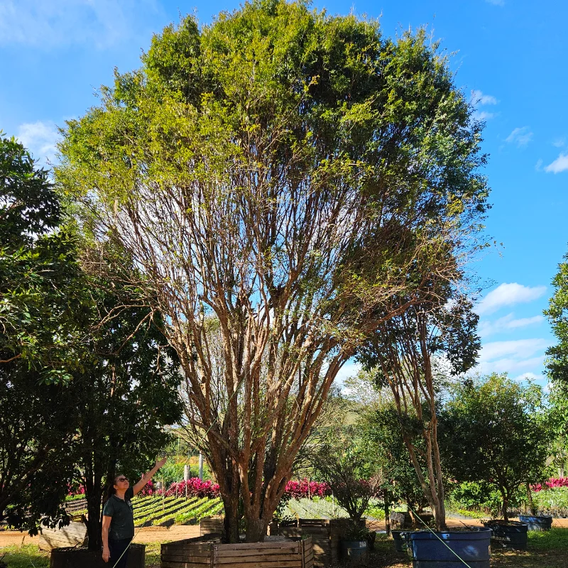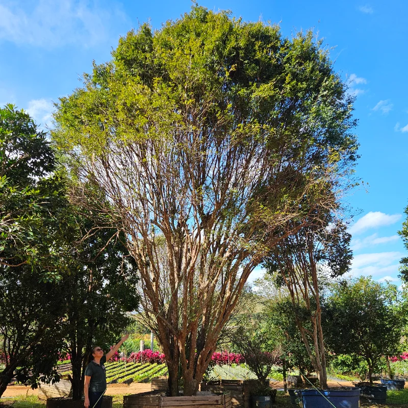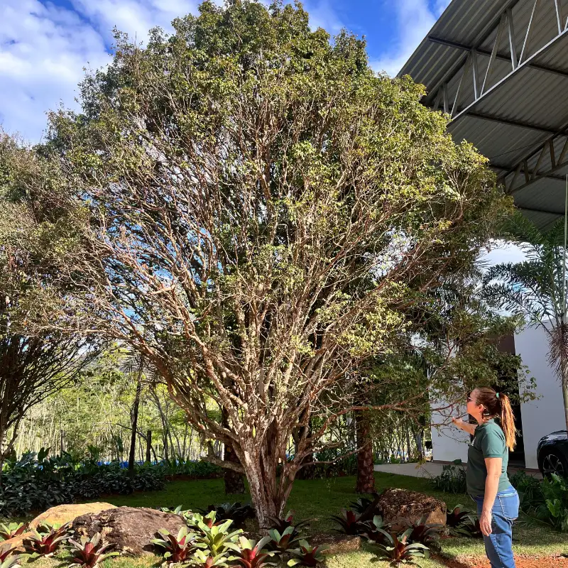 A jabuticabeira é uma árvore frutífera de médio porte, podendo atingir de 6 a 12 metros de altura quando adulta. Sua copa é densa e arredondada, com folhas brilhantes e verdes que conferem um belo efeito ornamental. O grande destaque são os frutos roxos, doces e suculentos que brotam diretamente do tronco e galhos, um fenômeno conhecido como caulifloria. Ideal para sombra, produção de frutos e embelezamento de jardins e chácaras, adapta-se bem a climas tropicais e subtropicais, preferindo solos férteis, úmidos e bem drenados. Esta planta está disponível já adulta, pronta para replantio em projetos urbanos ou rurais.