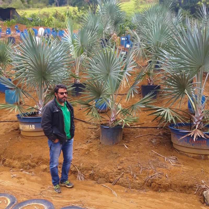 A Palmeira Bismarck é uma espécie ornamental de grande impacto visual, nativa de Madagascar. Quando adulta, pode atingir entre 10 a 12 metros de altura, com uma copa ampla e simétrica de até 6 metros de diâmetro. Suas folhas são largas, em forma de leque, com coloração cinza-prateada ou azulada, conferindo um ar exótico e elegante ao paisagismo. Ideal para regiões tropicais e subtropicais, adapta-se bem a solos bem drenados e a pleno sol. A planta adulta está pronta para replantio em áreas urbanas, condomínios, praças, sítios ou projetos paisagísticos de destaque.
