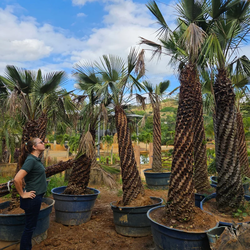A Palmeira Carandá é uma espécie elegante e rústica, que atinge de 10 a 20 metros de altura quando adulta. Seu tronco é ereto e delgado, com folhas em formato de leque, rígidas e verde-acinzentadas, formando uma copa simétrica e vistosa. É muito utilizada em paisagismo para criação de alamedas e como elemento vertical em jardins tropicais. Adapta-se bem a solos úmidos e margens de rios, sendo ideal para áreas com clima tropical ou subtropical. A Palmeira Carandá adulta está pronta para replantio imediato em propriedades rurais, áreas urbanas ou projetos de reflorestamento ciliar.
