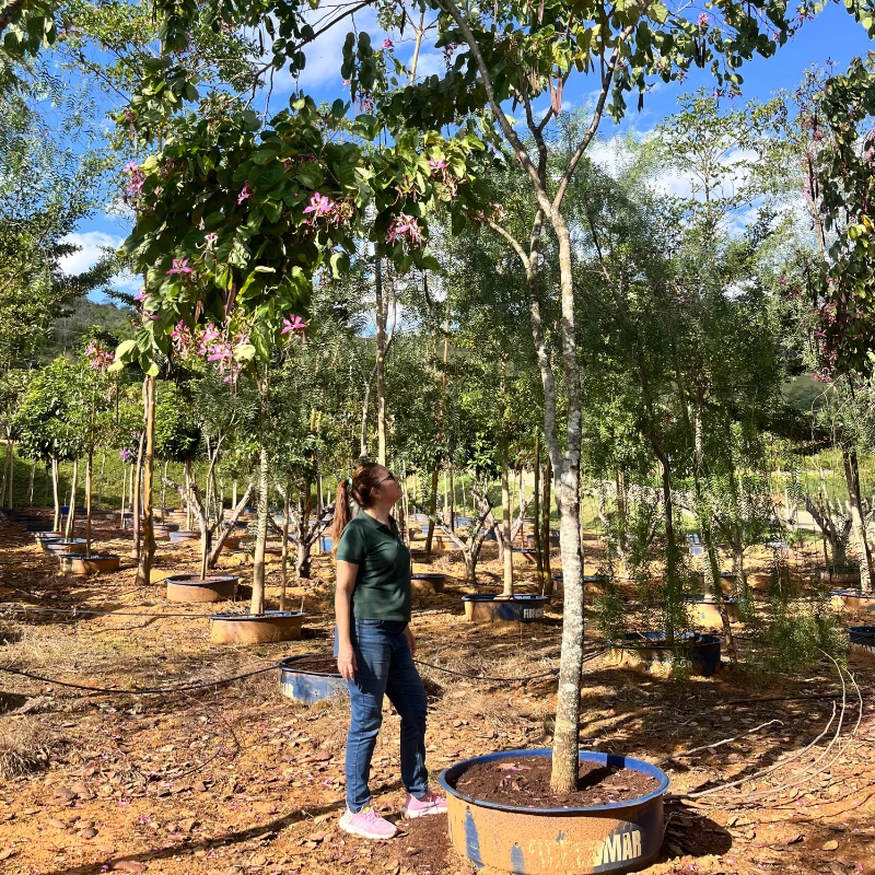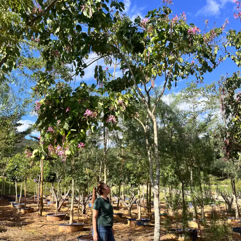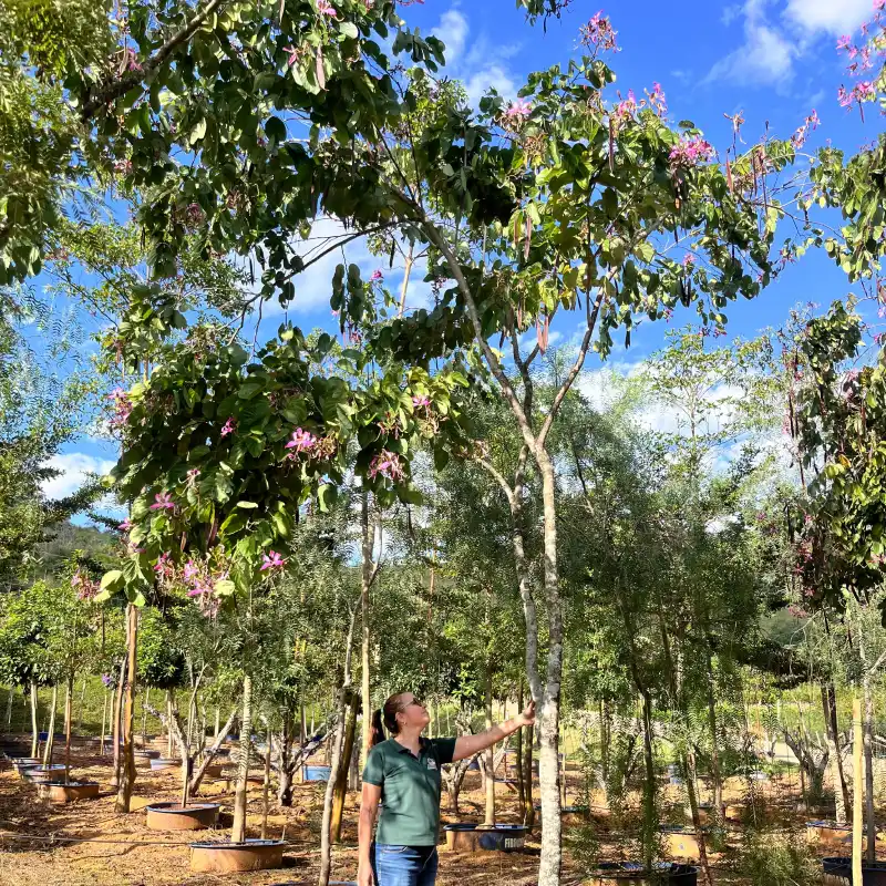 A Pata-de-Vaca é uma árvore ornamental de médio porte, que atinge de 6 a 10 metros de altura, com copa arredondada e folhas bilobadas que lembram a pegada de uma vaca — daí seu nome popular. Suas flores brancas ou rosadas surgem entre a primavera e o verão, perfumadas e atrativas para polinizadores. Indicada para paisagismo urbano e rural, é usada tanto pela beleza quanto pela sombra que proporciona. Desenvolve-se bem em solos bem drenados, sob sol pleno, e adapta-se a climas tropicais e subtropicais. Esta planta está adulta e pronta para replantio.