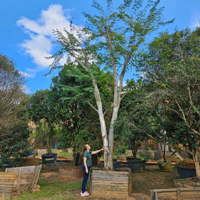 O Pau-Ferro é uma árvore nativa do Brasil, de grande porte e beleza marcante. Quando adulta, pode atingir de 10 a 20 metros de altura, com copa densa e folhas pequenas, compostas e bipinadas. Sua casca rajada, que alterna tons de cinza e branco, é altamente ornamental, fazendo dela uma escolha popular para paisagismo. Produz flores amarelas em cachos, atraindo abelhas e outros polinizadores. É indicada para áreas urbanas, rurais e projetos de reflorestamento. Prefere solos bem drenados e clima tropical ou subtropical. Esta planta está disponível em porte adulto, pronta para replantio.
