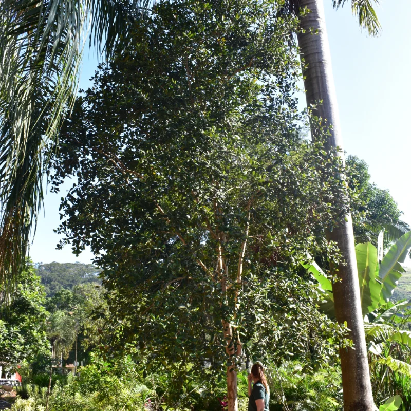 A Pimenta-da-Jamaica é uma árvore de porte médio, atingindo até 12 metros de altura, com copa densa e folhas perenes, brilhantes e aromáticas. Suas flores pequenas, brancas e perfumadas dão origem a bagas esféricas de coloração escura quando maduras, muito usadas como especiaria. Além do uso culinário, é valorizada em projetos de paisagismo tropical e agroflorestas. Prefere climas quentes e úmidos, solos bem drenados e ricos em matéria orgânica. Adapta-se bem a regiões costeiras e áreas sombreadas. Esta planta está em fase adulta e pronta para replantio em campo, sítios ou jardins especializados.