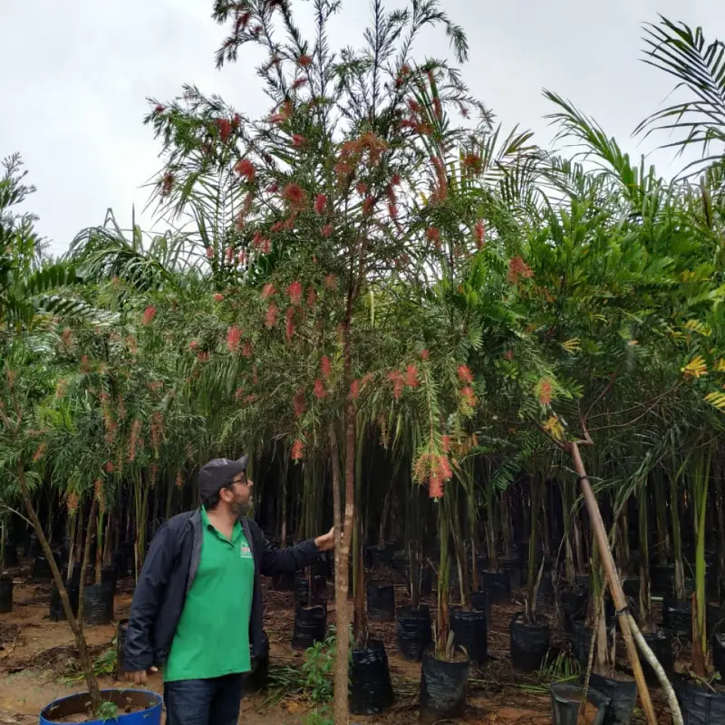 A Calistemu, popularmente conhecida como escova-de-garrafa, é um arbusto ou árvore de porte médio (3 a 5 m de altura), com copa arredondada e folhas perenes, lanceoladas e aromáticas. As flores são agrupadas em inflorescências cilíndricas vermelhas vibrantes, que lembram escovas – verdadeiros atrativos visuais. Ideal para paisagismo, atração de beija-flores e recuperação de áreas degradadas. Prefere clima tropical e subtropical, solo bem drenado, levemente ácido a neutro. Adaptada a condições urbanas e rurais, resiste bem a sol pleno e pode ser replantada adulta diretamente no local definitivo.