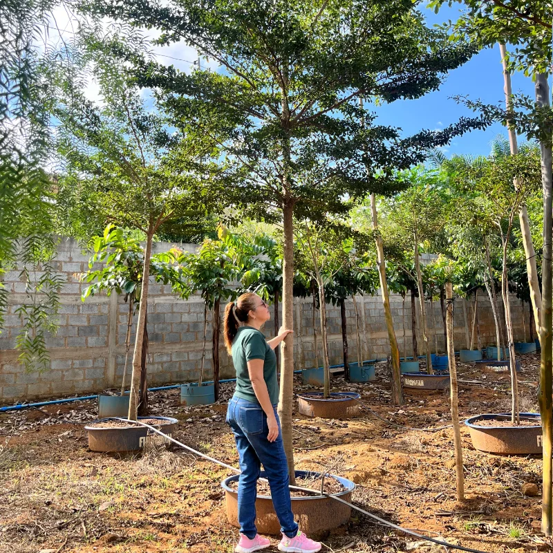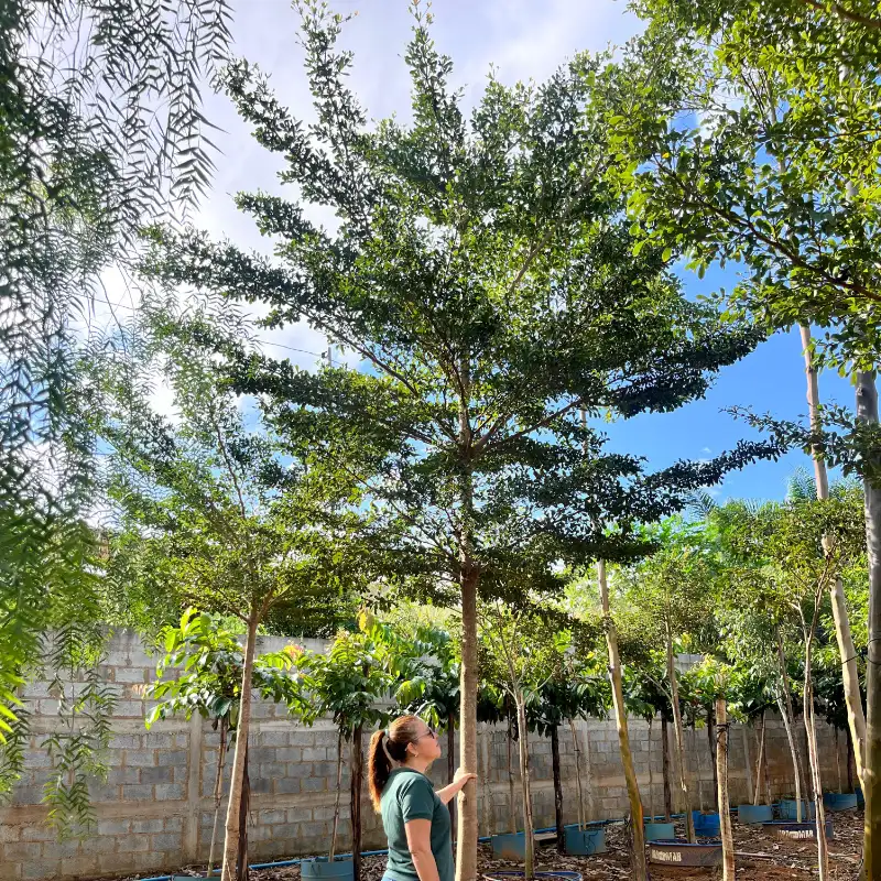 A Sete copas Africana é uma árvore de porte médio a grande, podendo atingir 8–12 m de altura quando adulta. Apresenta copa arredondada e densa, folhas verdes brilhantes lanceoladas e flores emerge em cachos, de coloração pequena e discreta. Ideal para sombra e uso paisagístico, se adapta bem a projetos urbanos e rurais, além de recuperação de áreas degradadas. Prefere climas tropicais e subtropicais, solos bem drenados a levemente argilosos, tolerando períodos de seca. Esta muda adulta já está pronta para replantio, garantindo um crescimento mais rápido no novo local.